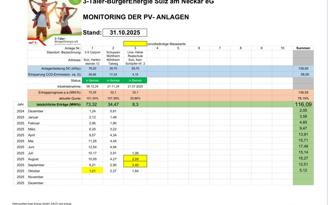 Erwin Hauser hat sich bereit erklärt, diese Fernüberwachung zu übernehmen, und die Daten am Ende jedes Monats in einer Tabelle zu erfassen. Oben auf dem Foto ist diese Tabelle mit Stand 31.Oktober 2025 dargestellt: